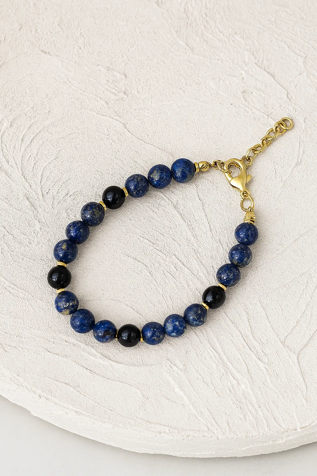Blue Prism Band brings together the wisdom and truth of lapis lazuli with the grounding protection of black onyx. This pairing sharpens intuition, strengthens self-expression, and anchors the mind in clarity and strength.