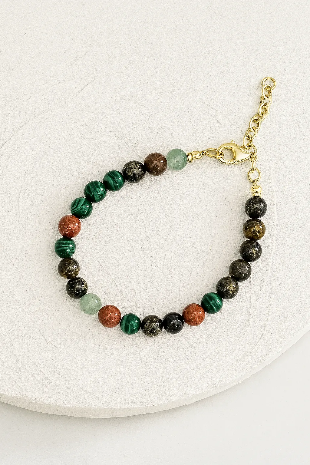 Chakra Trail Band is designed as a journey of alignment and strength. Malachite encourages transformation and heart healing, pyrite fortifies confidence and protection, hematite grounds and stabilizes, red jasper fuels vitality, and green aventurine opens pathways for growth and renewal. Together, they create a balanced flow of energy across body and spirit.