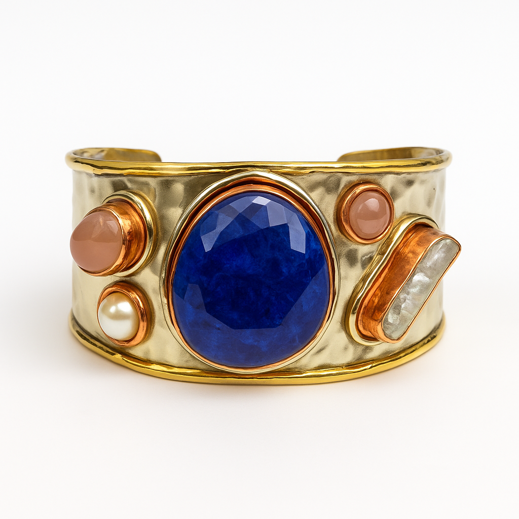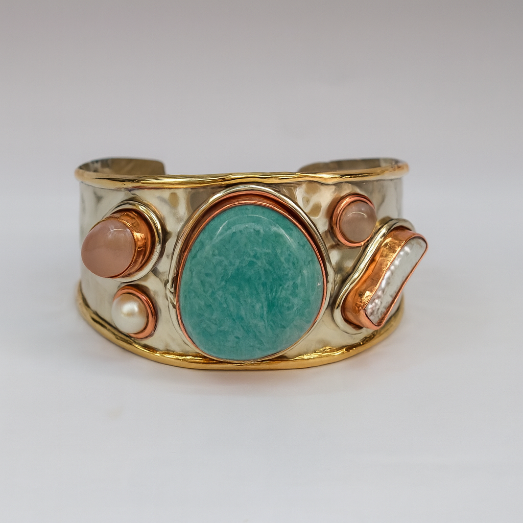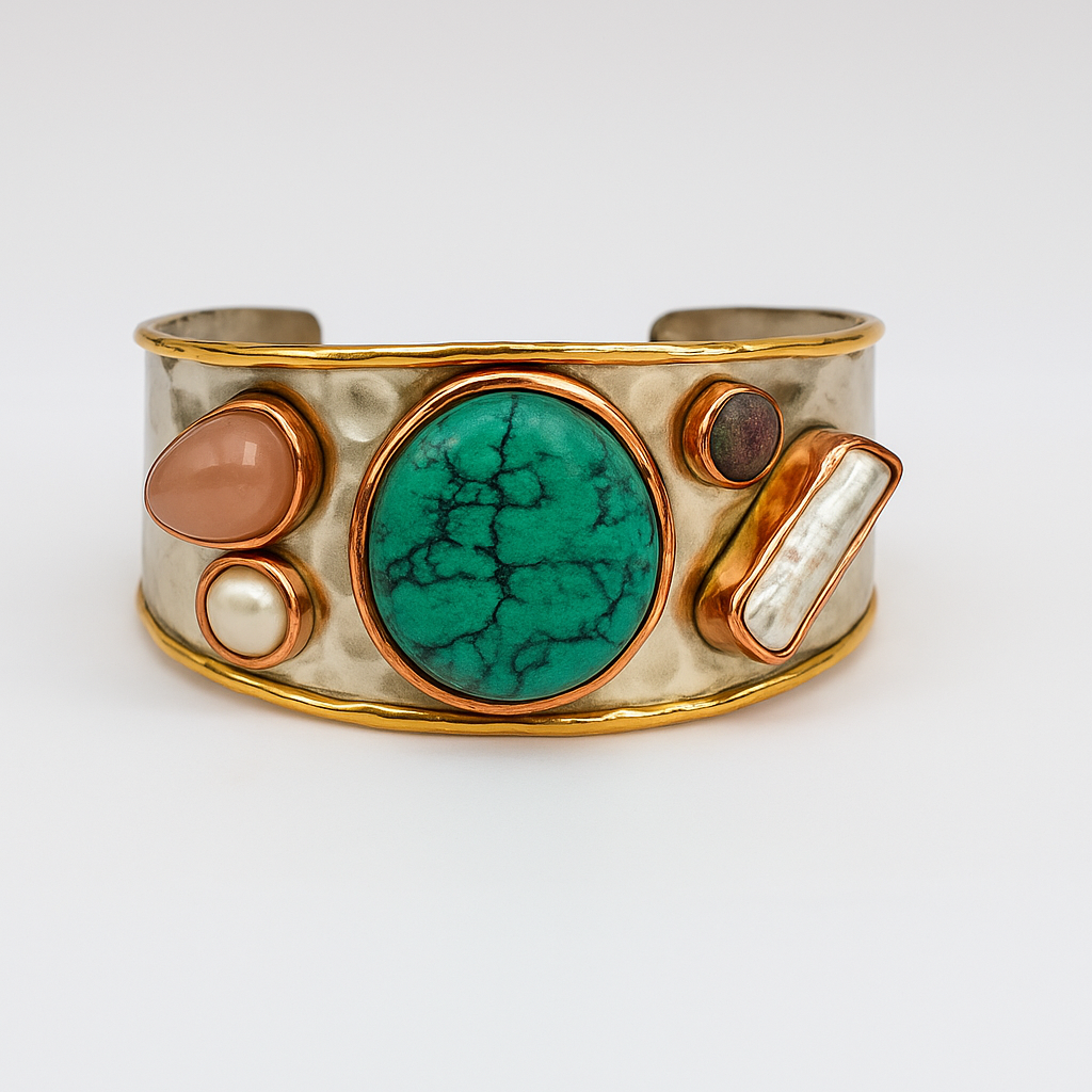 A sculpted homage to nature’s forces—where Amazonite flows like water, stones pulse with earth’s quiet fire, and hammered metals echo the ancient crown of a modern-day empress.