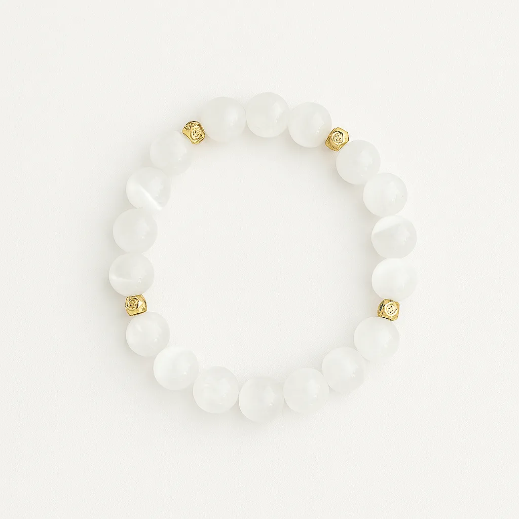 Ethereal Bracelet is inspired by the cleansing energy of selenite — a stone of clarity, light, and spiritual alignment. It purifies the mind, uplifts the spirit, and invites a sense of calm illumination.