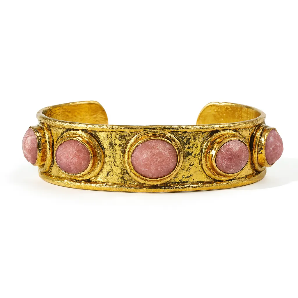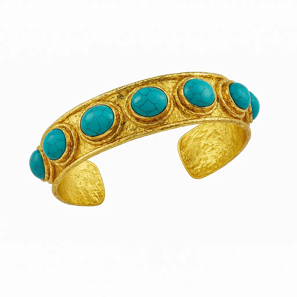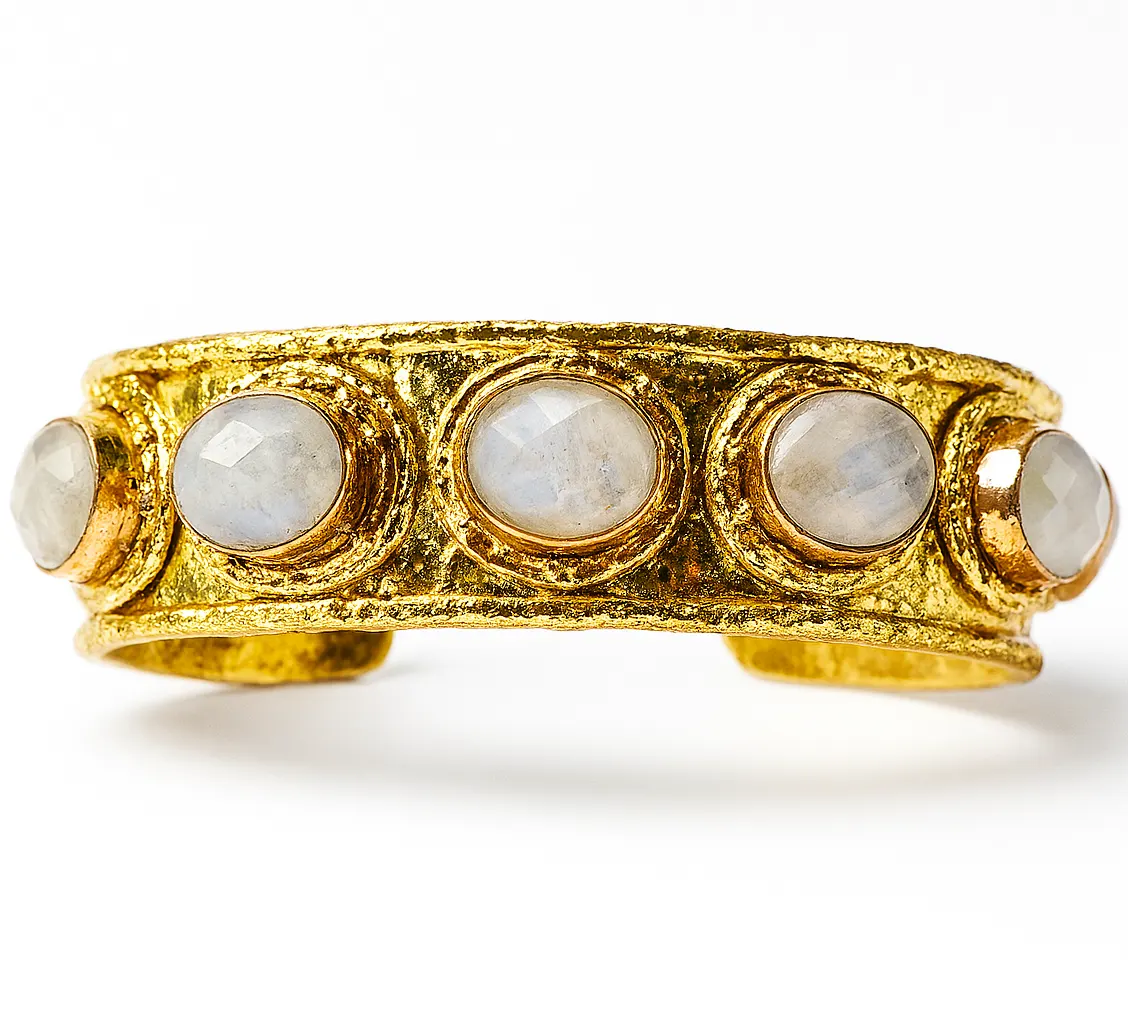 Inspired by the moon’s shifting form and the quiet radiance of celestial nights, the Lunaris Cuff features a constellation of stones scattered like stardust— each fragment a frozen shimmer of lunar light. Its hammered gold form curves fluidly around the wrist, raw yet luminous, like the surface of the moon kissed by shadow and fire.
