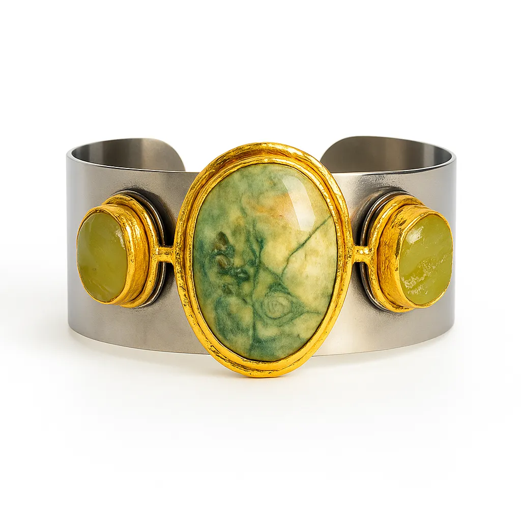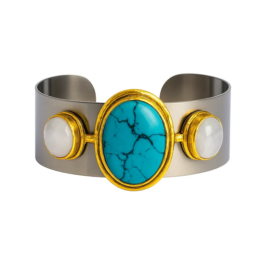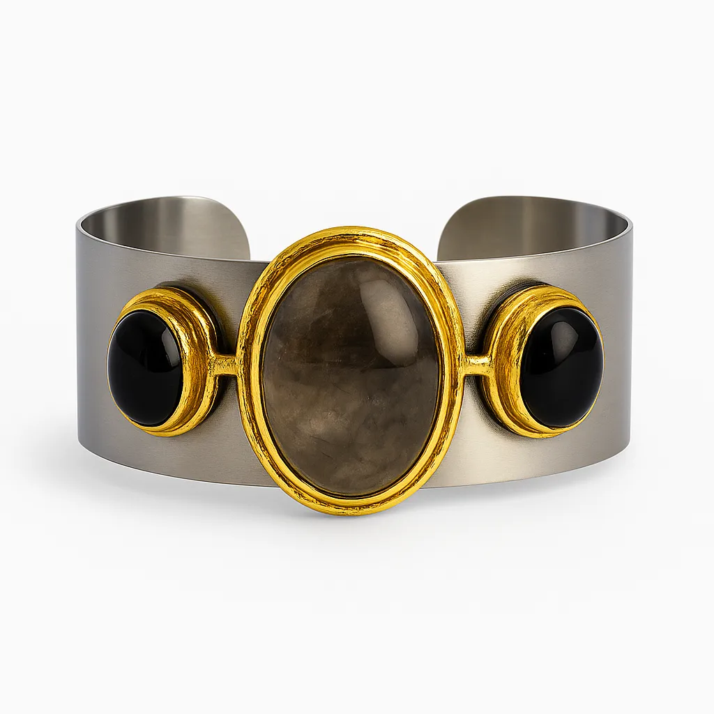 A bold yet meditative statement, the Nocturne Halo Cuff channels the serenity of moonless skies and the quiet gleam of elemental power. Like a midnight halo suspended in stillness, it balances grounded earth tones with celestial mystery. Whether worn as an everyday amulet or a high-fashion accent, the Nocturne Halo is a nod to the mystique within.