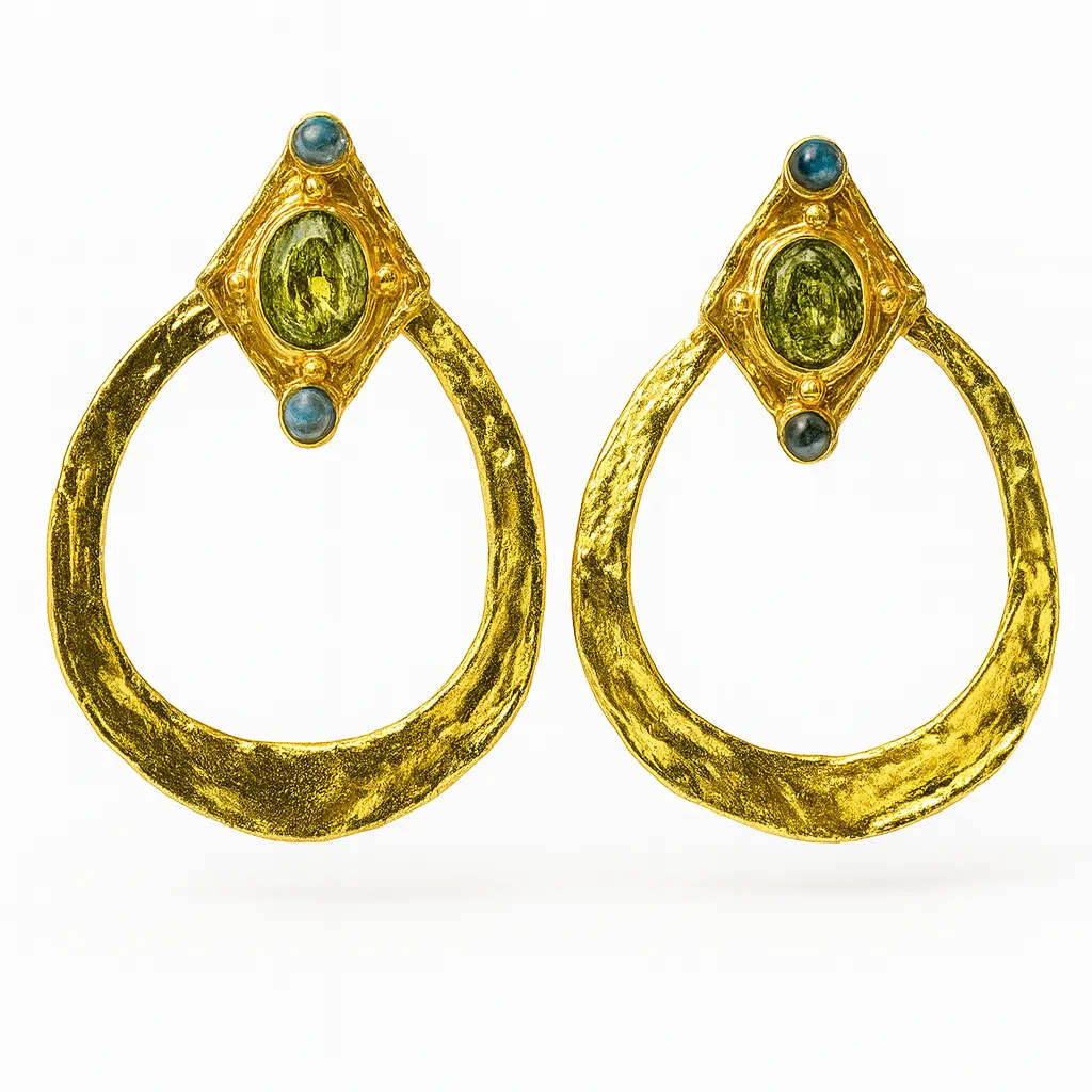 The Persian Sol Earrings echo the opulent artistry of ancient Persia — a realm where geometry met poetry and light was worshipped as divine. The textured gold loops recall the burnished glow of desert sunsets, while the twin gemstones mirror fire and sky — a union of earth’s strength and celestial grace.