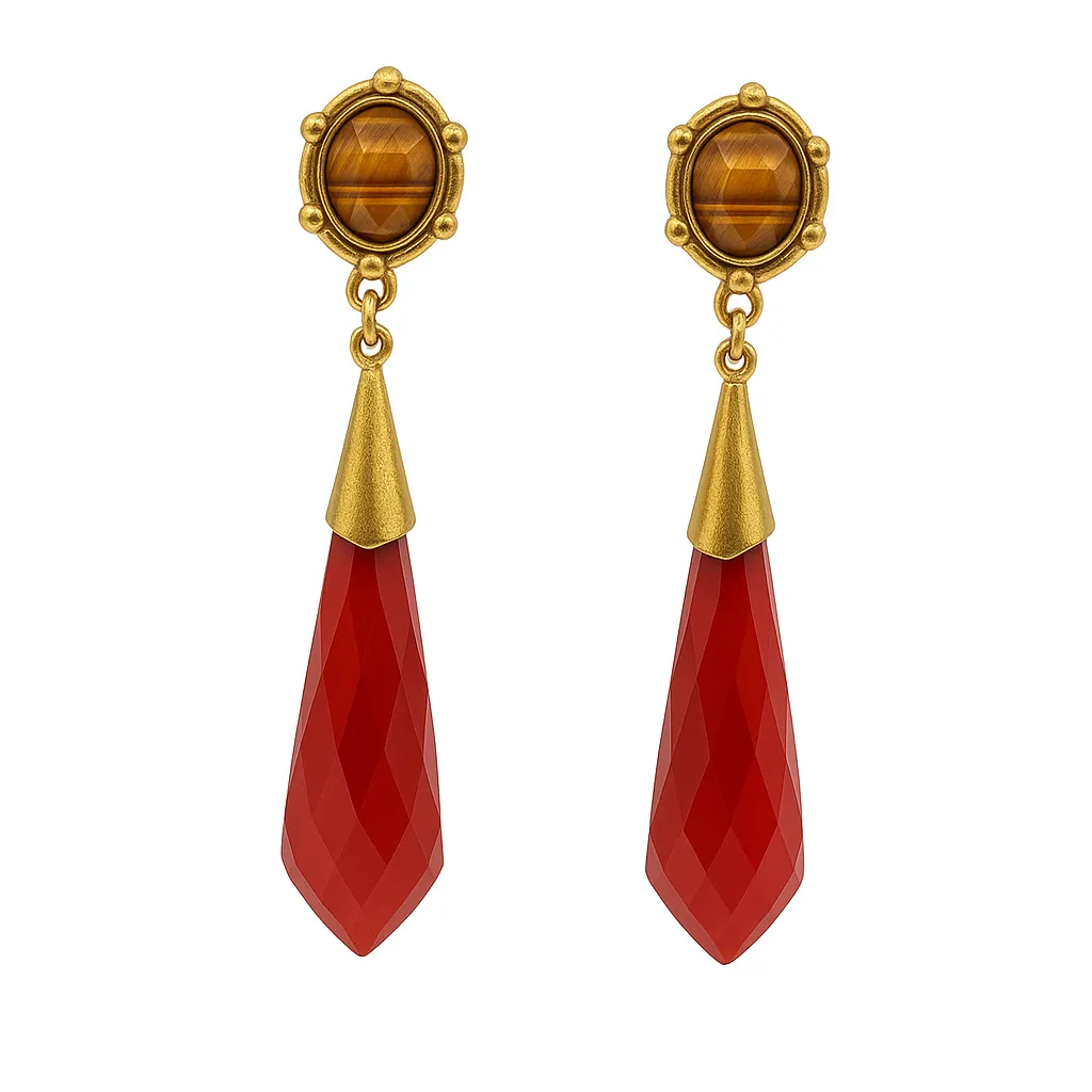 The Petra Flame Earrings pay homage to the rose-red city carved in stone. Their golden forms frame a fiery drop that glows like a relic of ancient desert marvels — bold, architectural, and timeless.