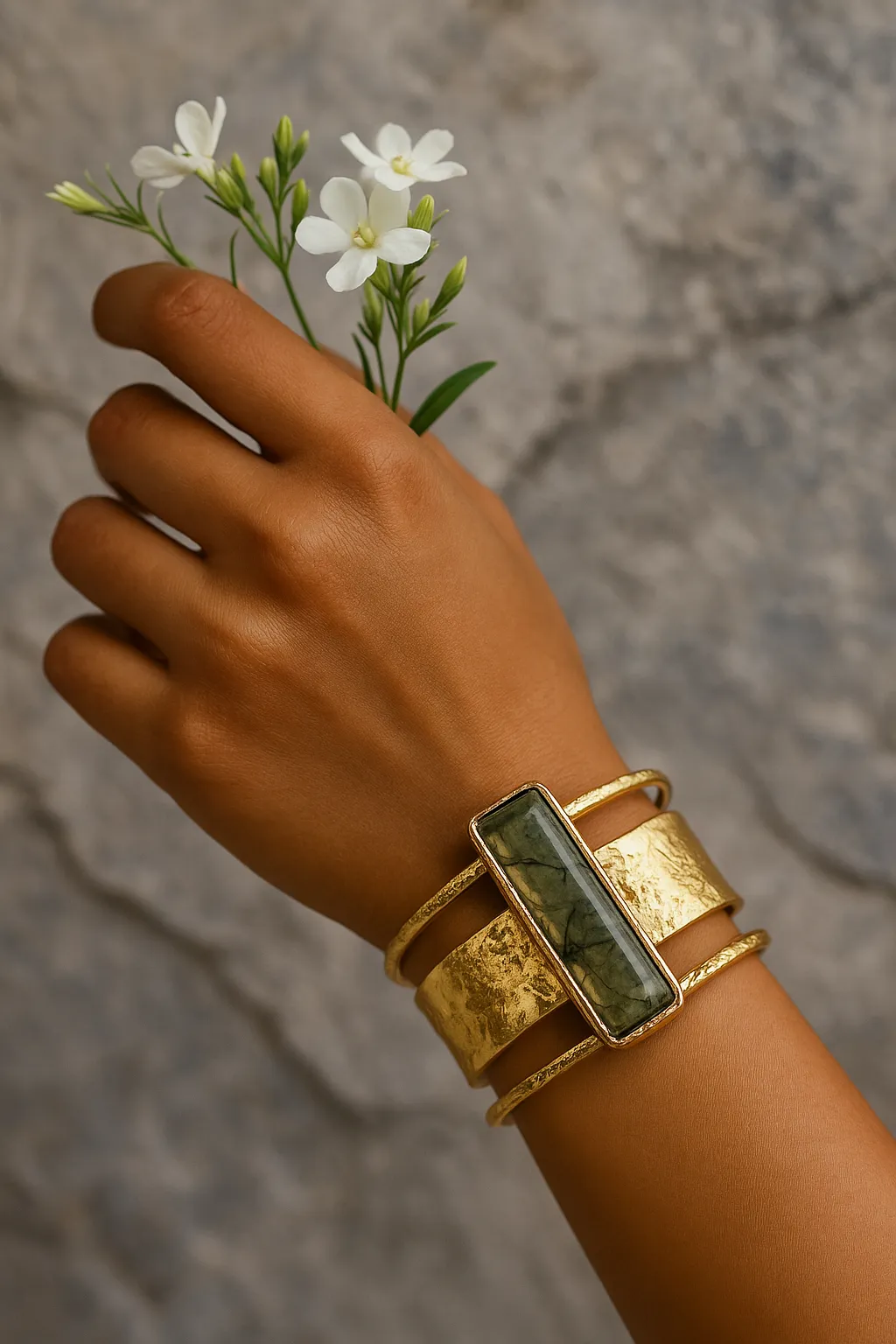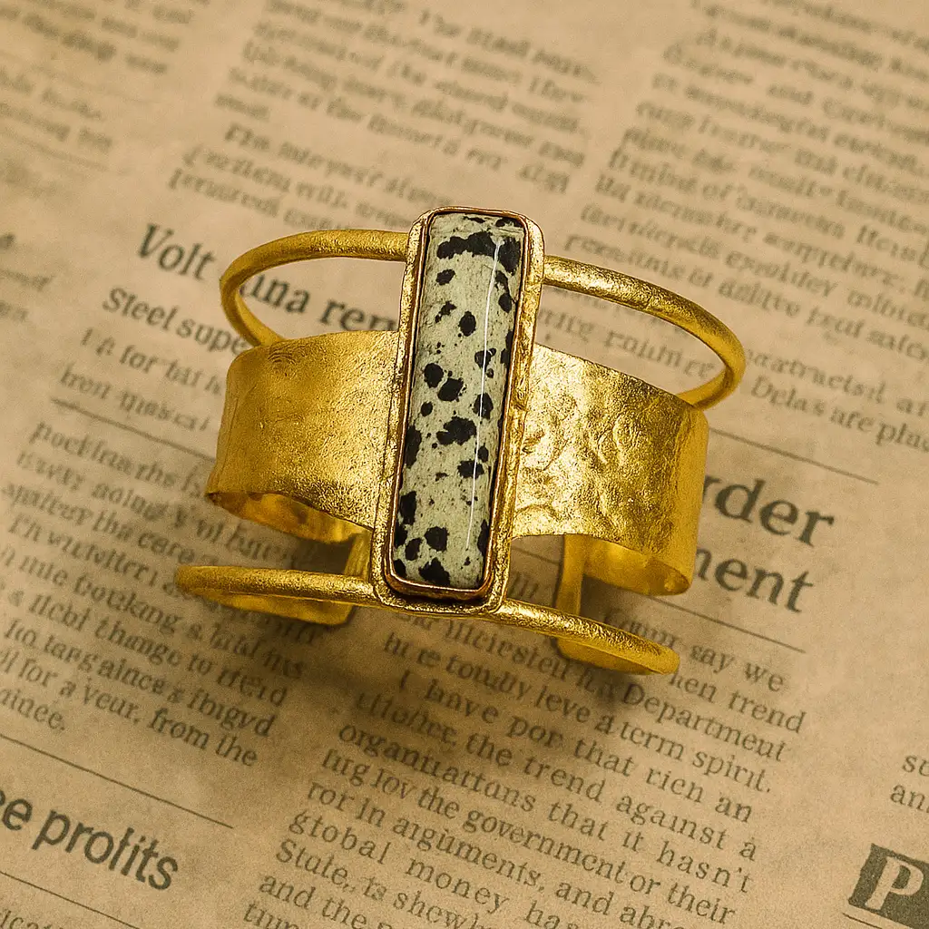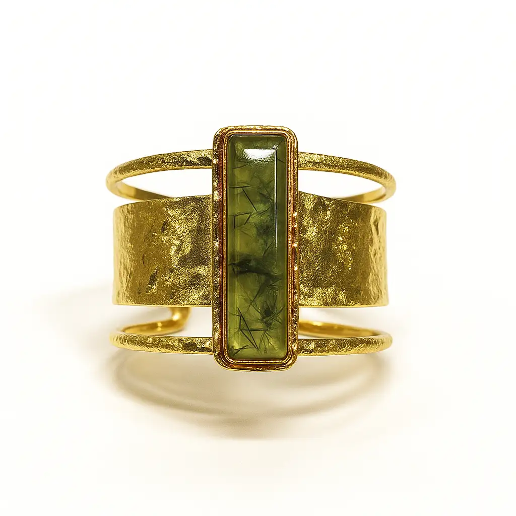 The Pyra Cuff is a bold interplay of geometry and texture. Its central elongated form rises like a monolith, anchored by a band of hammered gold that recalls ancient relics.