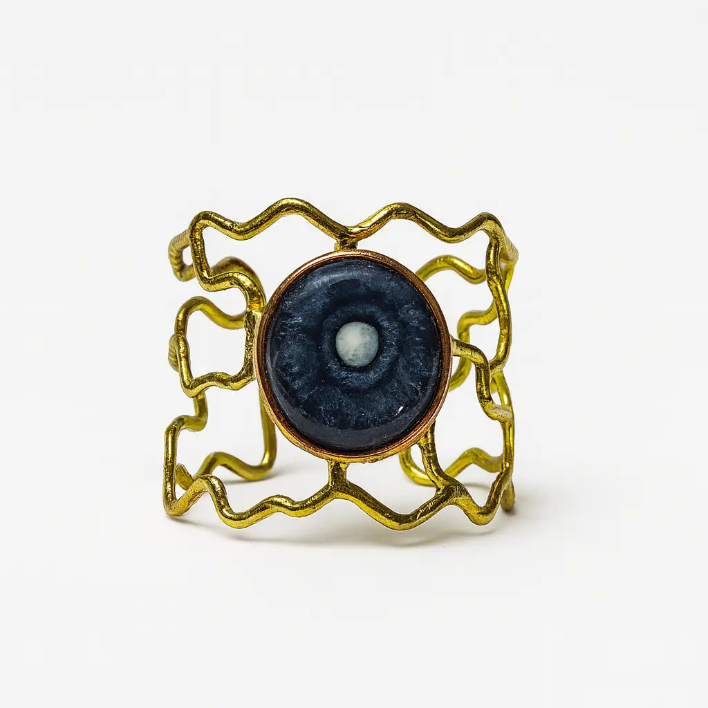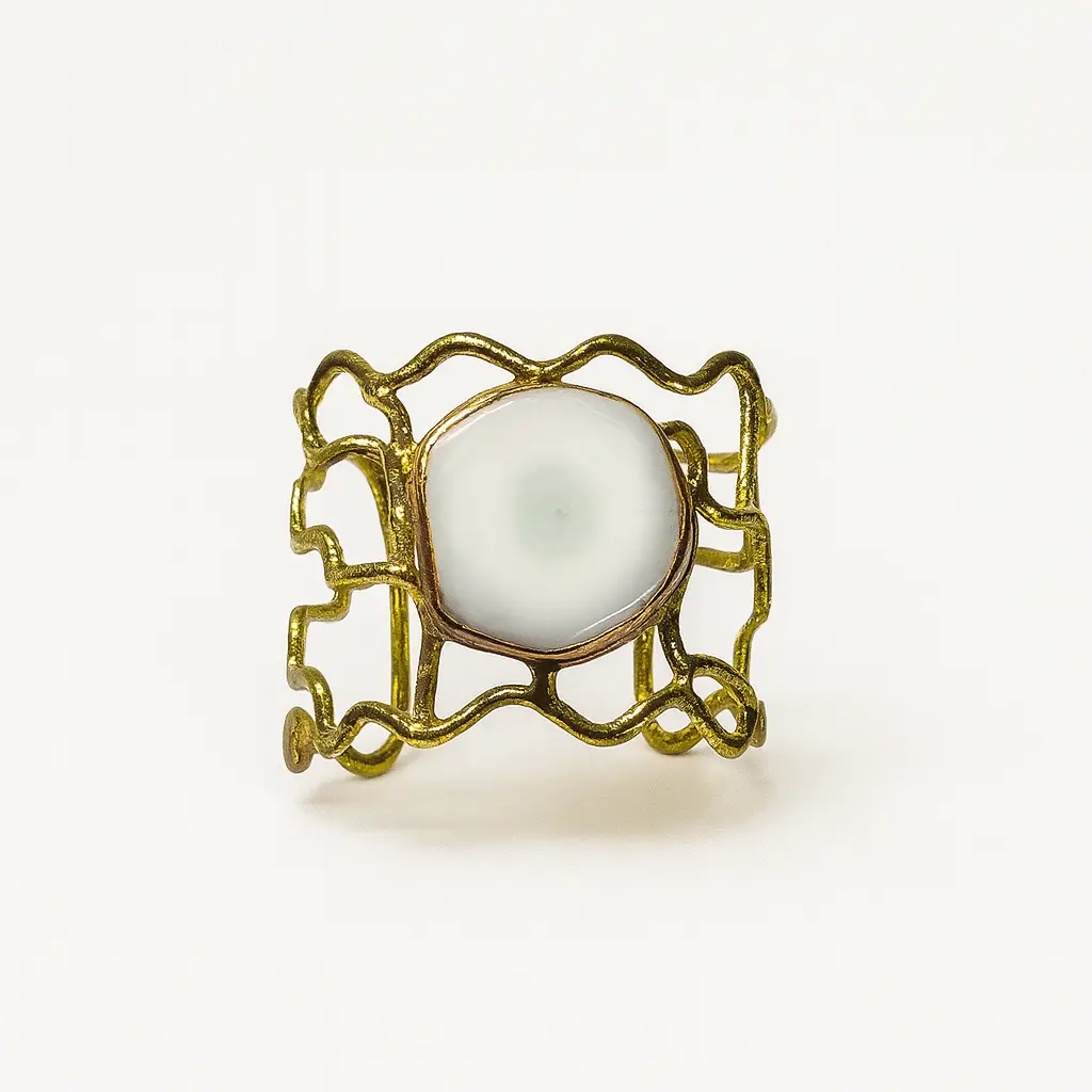 An organic statement piece from the Topographica Collection, the Ripple Relic Cuff captures the poetry of shifting landscapes. Its fluid, openwork form mirrors the natural rhythm of ripples, anchored by a striking centrepiece that feels both ancient and timeless.