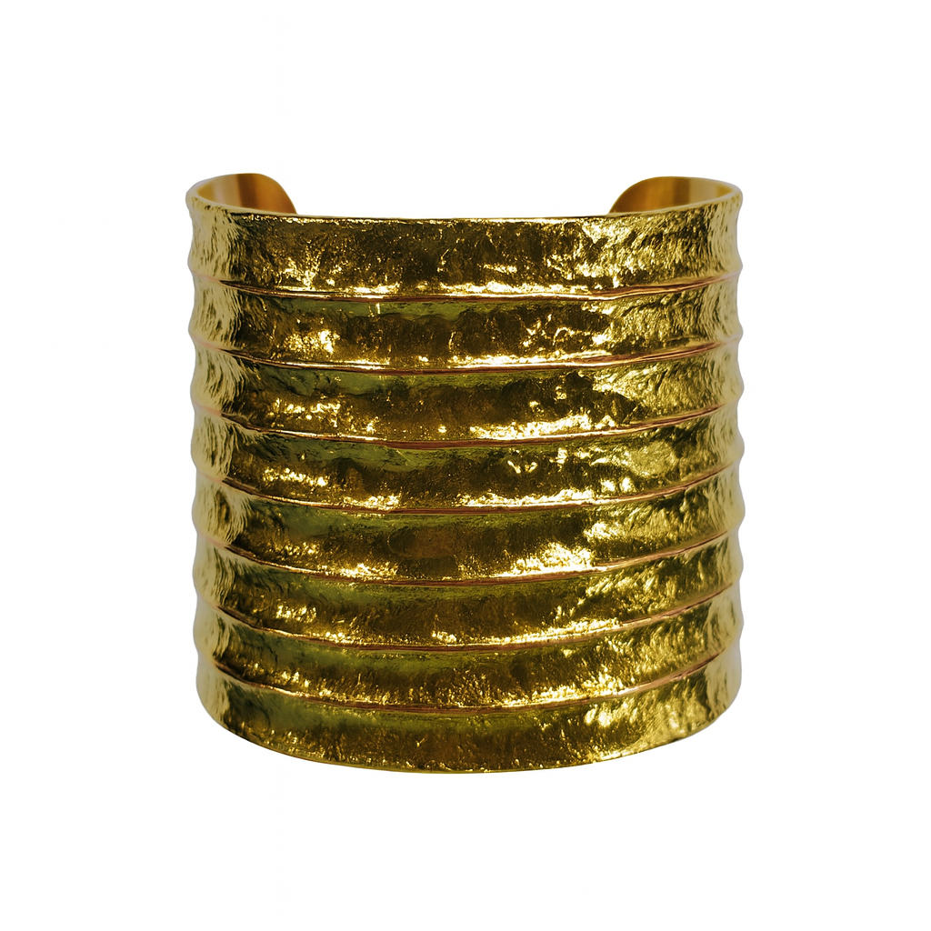 The Strata Crown Cuff is defined by its tiered form—bands of textured gold stacked in deliberate rhythm. Each layer holds its own presence, coming together to create a structure that feels both grounded and commanding.