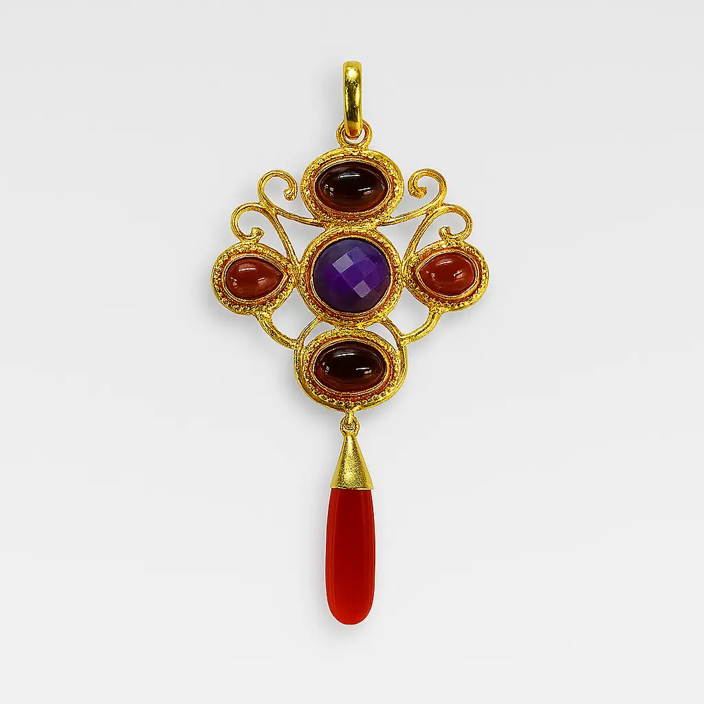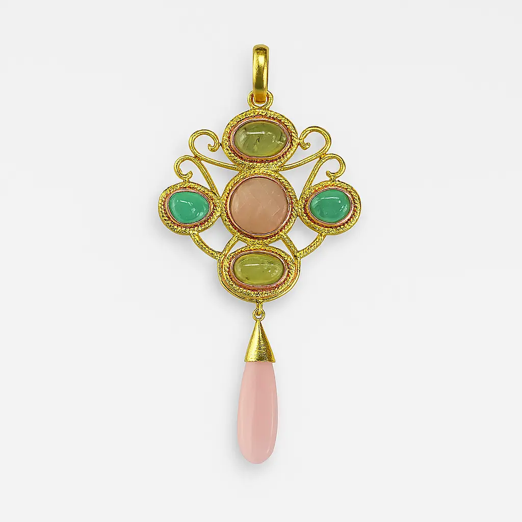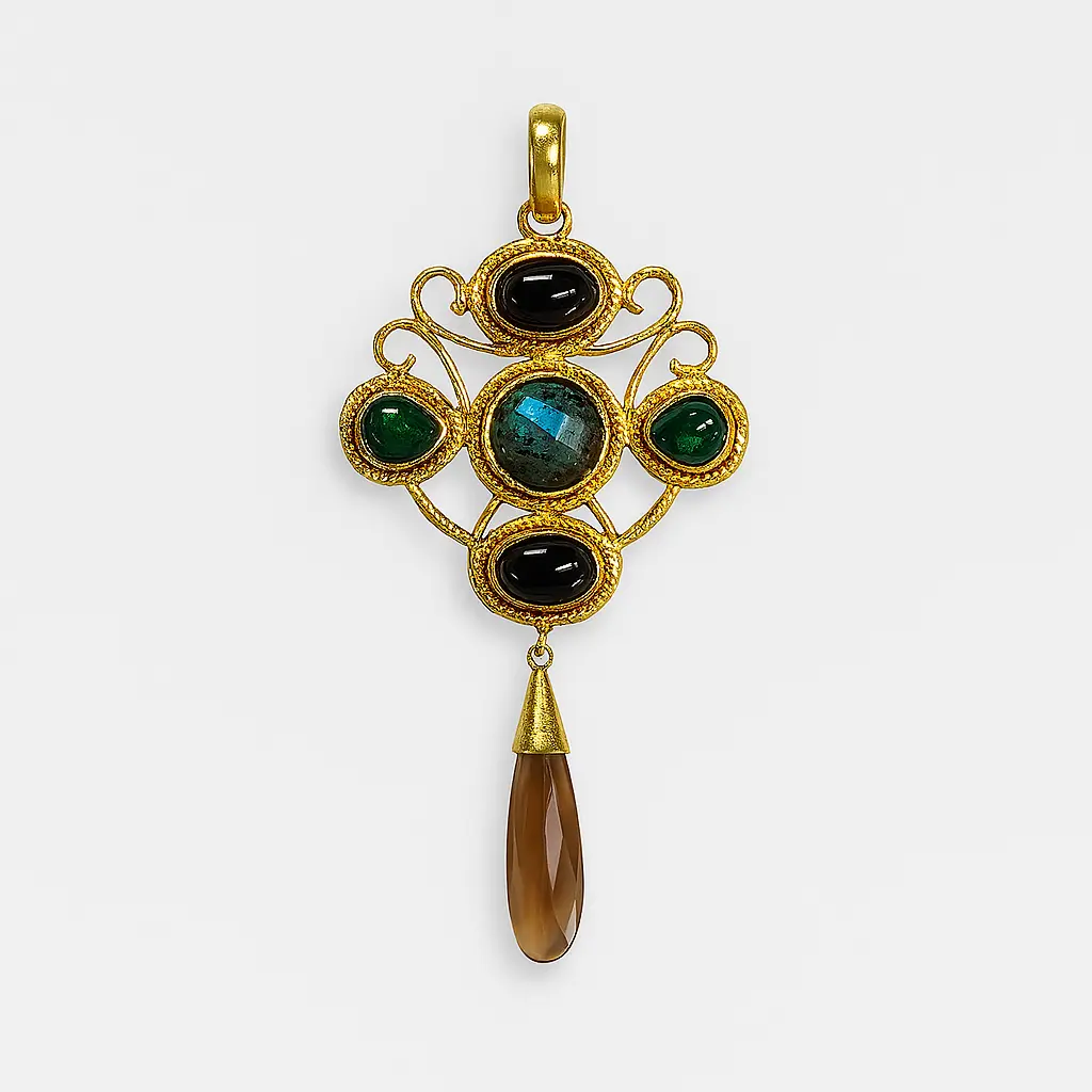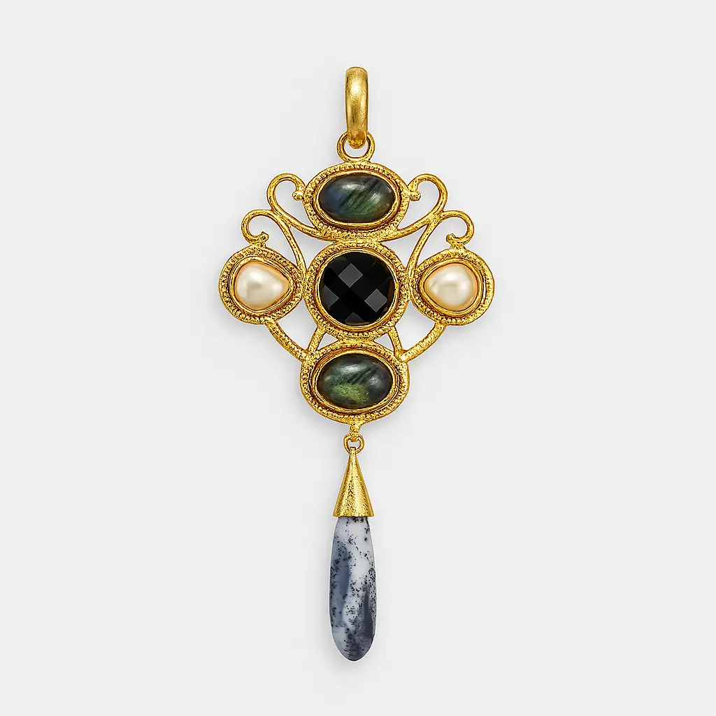 The Twist of Flora Pendant blooms with organic symmetry, its golden whorls recalling petals and tendrils in graceful motion.A harmony of sculpted forms and luminous accents, it captures the spirit of nature’s eternal flourish — bold, fluid, and timeless.